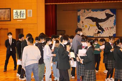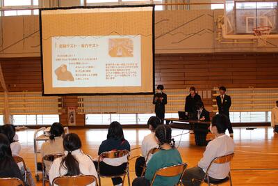 11月21日(金)の5,6時間目に「新入生説明会」を実施しました。この取り組みは、毎年1年生が担当し、「二中いいね!プロジェクト」と称し、ねらいを①小学生・中学生が楽しめる会、②両小学校が楽しめる会、③二中のことを知ってもらい、来るのが楽しみになる会、の3つとし、この3つの達成に向けて準備を進めてきました。