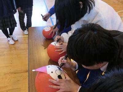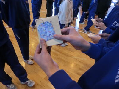 3年生はいよいよ来週から私立高校推薦入試が始まります。3年生一人ひとりに心温まる手作りの「お守り」の贈呈、さらに手作りの「だるま」の贈呈、最後に「大エール」をみんなで行いました。