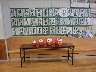 < 3年生教室前の書初めの前に飾った「だるま」 >
