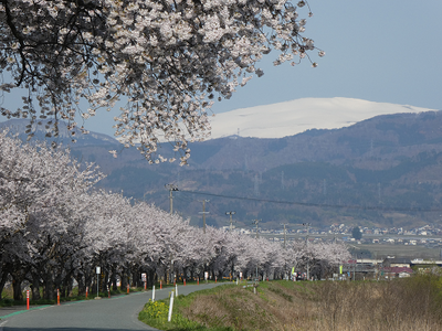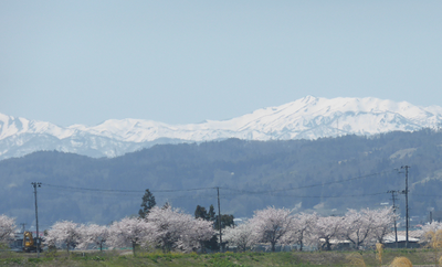 今朝の通勤途中の景観です。青空に月山と朝日連峰が白銀に輝き、白水川の堤防には桜が満開。この美しいコントラストに心もわくわく、今日も頑張れそうな予感と、何か良いことがあるのでは?と勝手な妄想を抱きながら出勤しました。