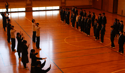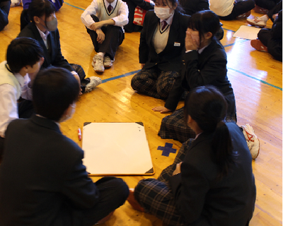 また、午後は生徒会主催の1年生歓迎集会が行われました。学年オープンで班編成がおこなわれ、学年を超えた穏やかな雰囲気で会が進みました。ジェスチャーゲームでは、「駅伝」や「雪合戦」、「サッカー」などのお題を、言葉を使わず身振り手振りで表現し、班対抗で正解を競い合いました。